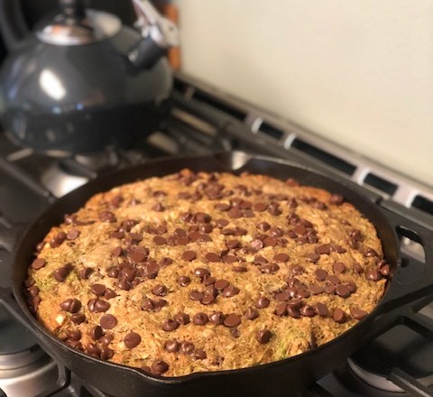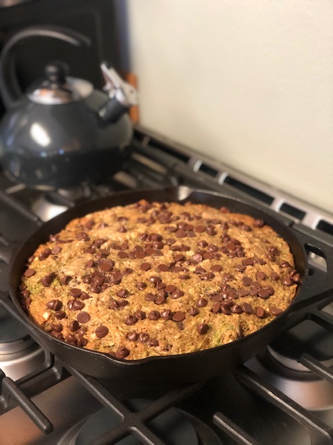 This recipe was exactly what I was looking for… something with zucchini, cause, well.. duh, it’s zucchini season! It has chocolate, always a bonus! It is made in a cast iron skillet. I love cooking with cast iron and right now we are in transition, so most of my baking things are packing in storage. I do however have a couple of my cast iron skillets so this was perfect!